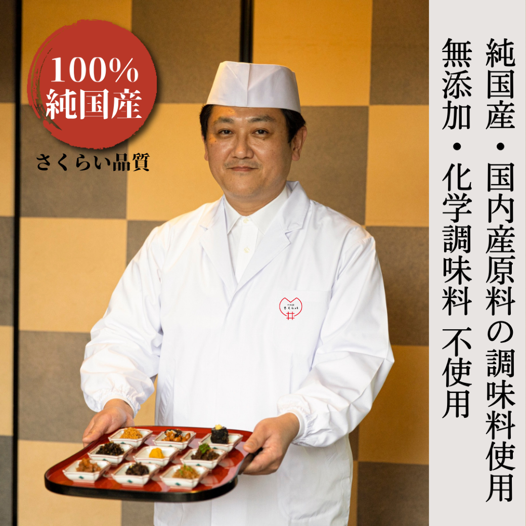 瀬戸内のきめの細かい上質なちりめんじゃこを、京都の純米酒・全て国産原料の丸大豆醤油・種子島のざらめ、この3つの調味料だけで焚いています。